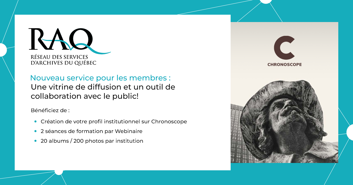 A l’occasion de l’Assemblée générale annuelle du RAQ, une formation à l’utilisation du Chronoscope est offerte par Louis-Pascal Rousseau, directeur général Savoir Citoyen. Afin d’encourager le plus grand nombre de personnes à se familiariser avec cette plateforme, cette formation est ouverte aux représentants de toutes les institutions, y compris celles qui ne sont pas membres du RAQ. Toutefois, seules les institutions membres du RAQ bénéficieront d’un abonnement annuel à la plateforme. chronoscope.net